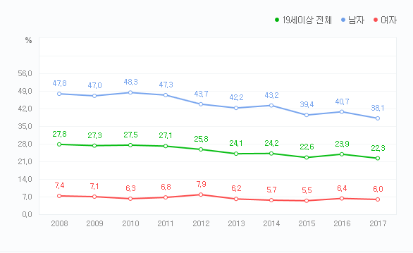 ▶KOSIS (보건복지부, 국민건강영양조사)에 따르면 19세 이상 전체 22.3%가 흡연을 하고 있는 것을 알수 있습니다.